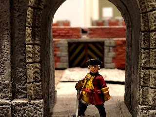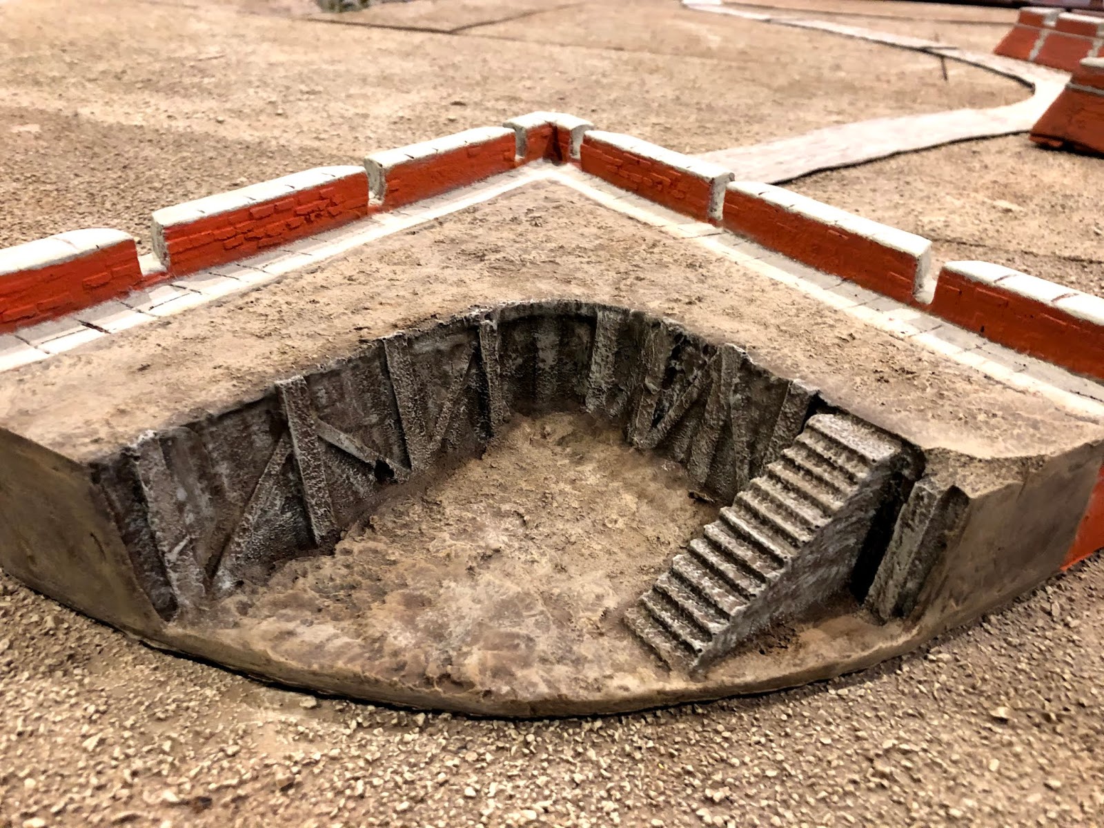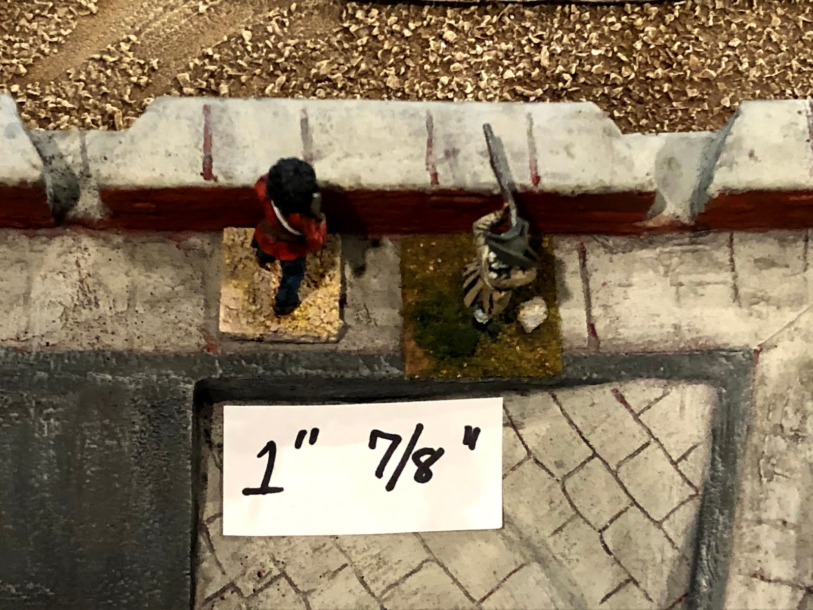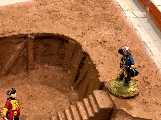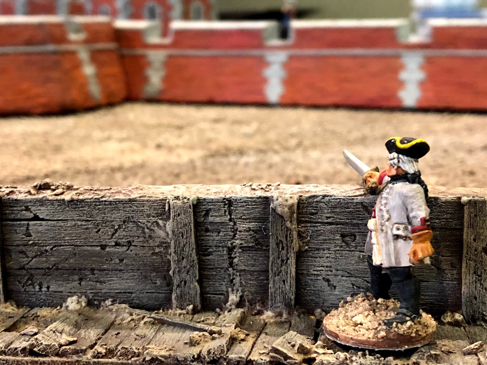 The officer in blue shown above is a good representation of me at this point — pondering how best to paint the WOOD BRACING holding back the earth packed against the walls…
