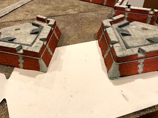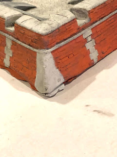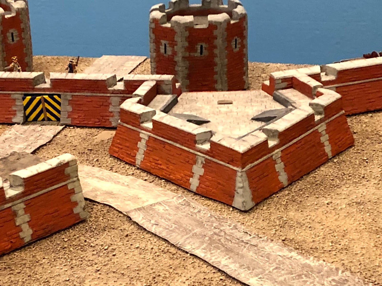 Further study of the few Vauban pics in the book revealed the front corners of the bastions also had been severely worn down, and were originally designed with crisp and clean rows of stone.   This convinced me paint over the red front corners with the four colors of Delta Ceramcoat paint I used for all the stonework:  (1) RAIN GREY (2) MUDSTONE (3) QUAKER GREY (4)  SANDSTONE…