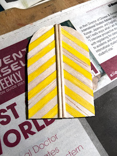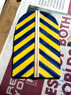 Having been very happy with the “heraldic” door paint job, I decided to do the same again for this much larger arched door. First on cardboard using magic marker, and then with balsa wood and paint…