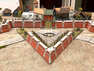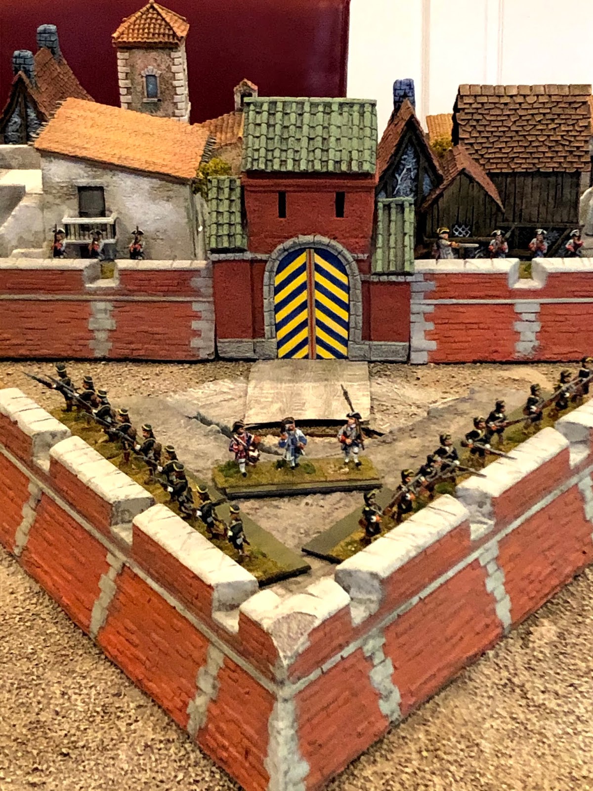 I had looked at a lot of photos and illustrations of Vauban forts and most of them seemed to have more elaborate front gates than the one for my friend’s fort, which was just an identical wall section with an entry added to the middle, as seen here: