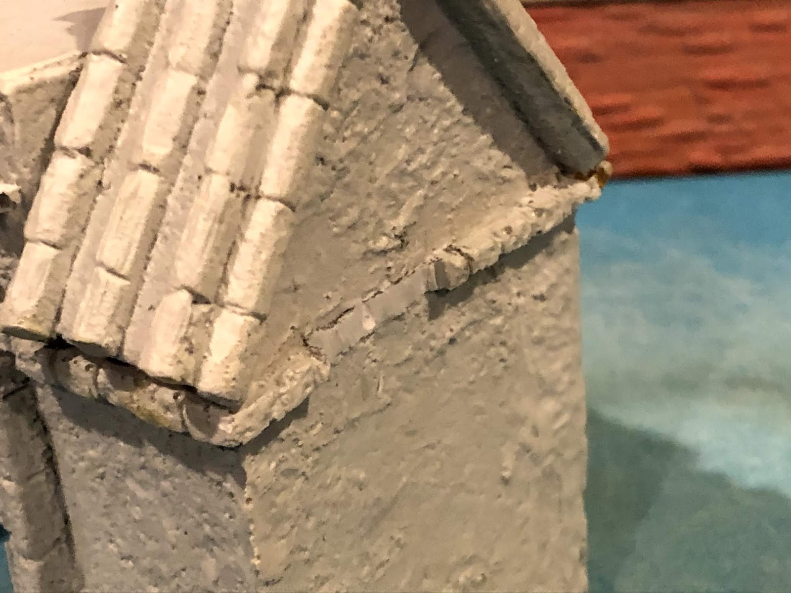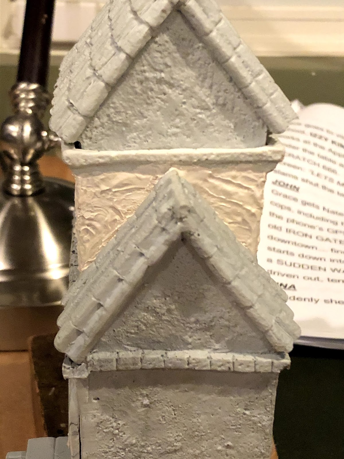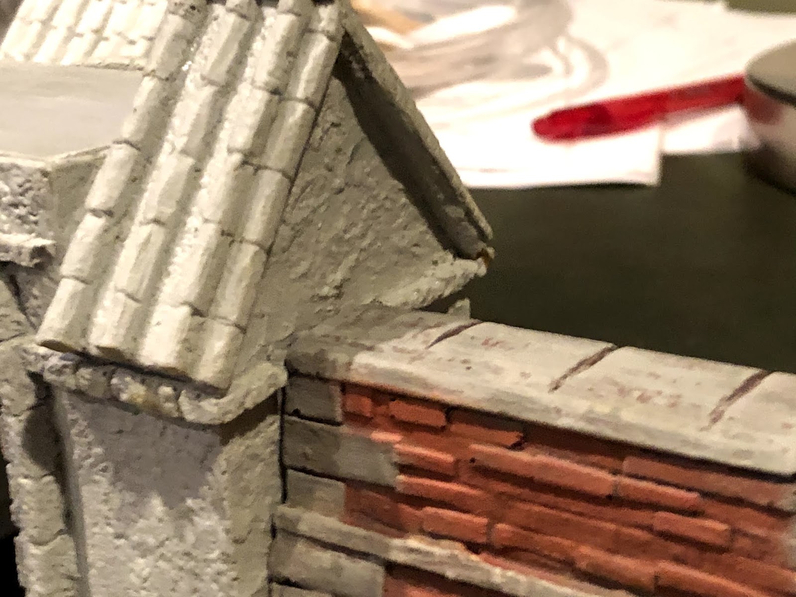 It was a bit of a bummer at first but the commenter was absolutely correct! I had noticed the relative darkness of the gatehouse despite the fact that it was painted with what I believe was the exact same paints as all the other pieces before it! I think this was due to its rougher texture, which gave it built-in shadows, compared to the smooth finish of the brickwork on all the Ian Weekley designed pieces. I had considered doing something about this but as the gatehouse had already gone through the somewhat involved weathering wash process and then been spray sealed, I put the issue out of my mind…