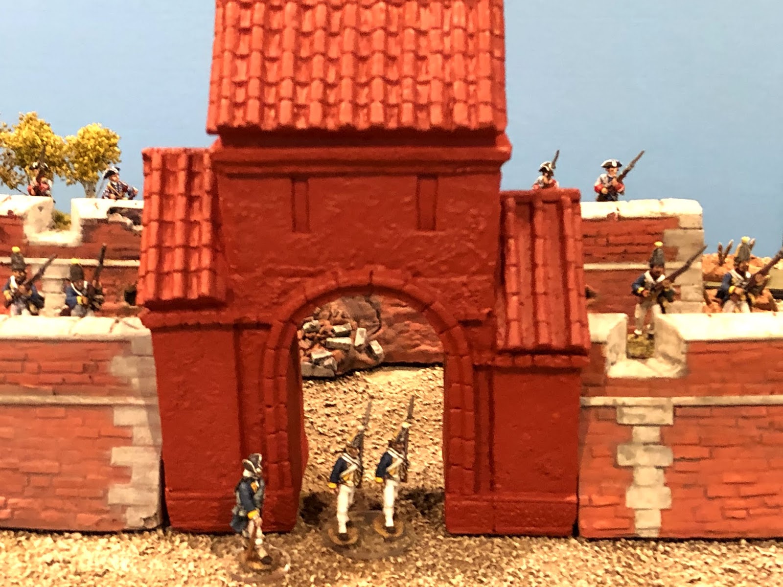 I tested another coat on a side wall and the building took the paint without any trouble. After that I went over the entire gatehouse with 2 lighter shades of color. In the end it’s still a bit darker than the rest of the fort, but it’s definitely lighter and I think a closer match. And my expat friend in a foreign land is happy with it, which is really all that counts!