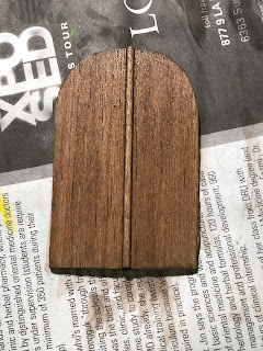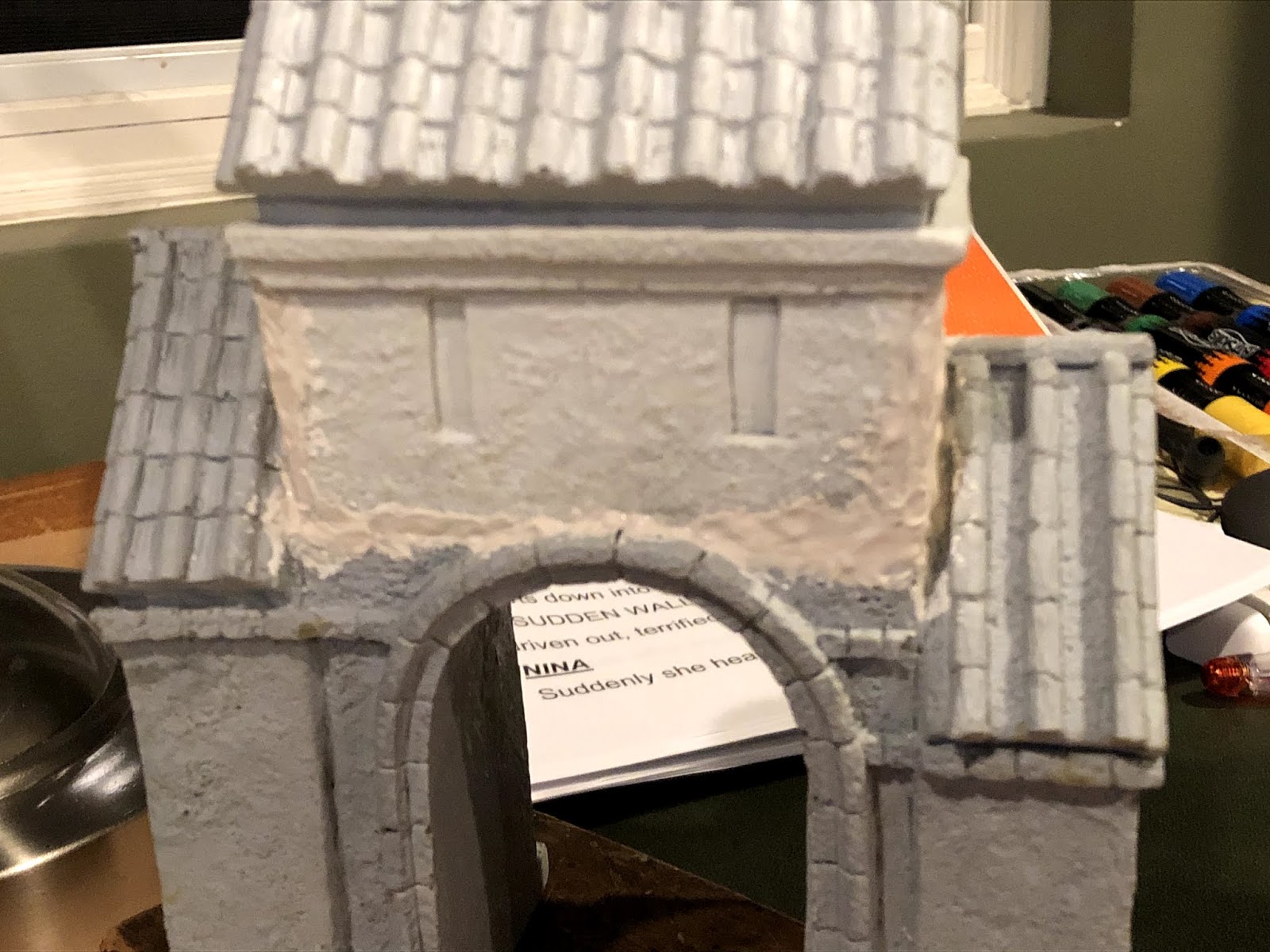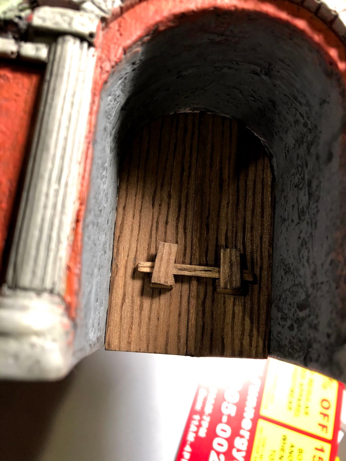 It was a close call but he decided he wanted the two-story version. It had some gaps between the assembled upper story pieces but I was pretty confident I could fill them with a combo of balsa wood and some wood filler. I also trimmed a piece of stone molding off the side wall in order to allow the gate to sit flush with the end of the wall next to it. Below are a lot of pics, including my duplication of the heraldic door for this larger gateway: