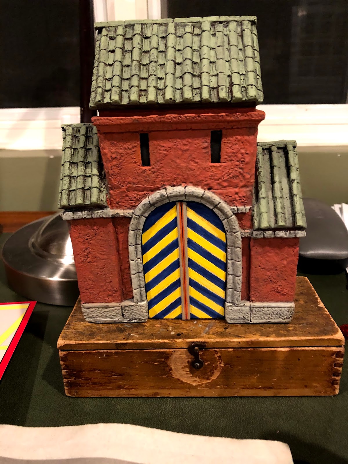He really liked the idea of a green copper roof, so that’s what I did, and I think it was a good choice. I used Delta Ceramcoat WEDGEWOOD GREEN…
