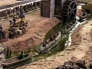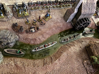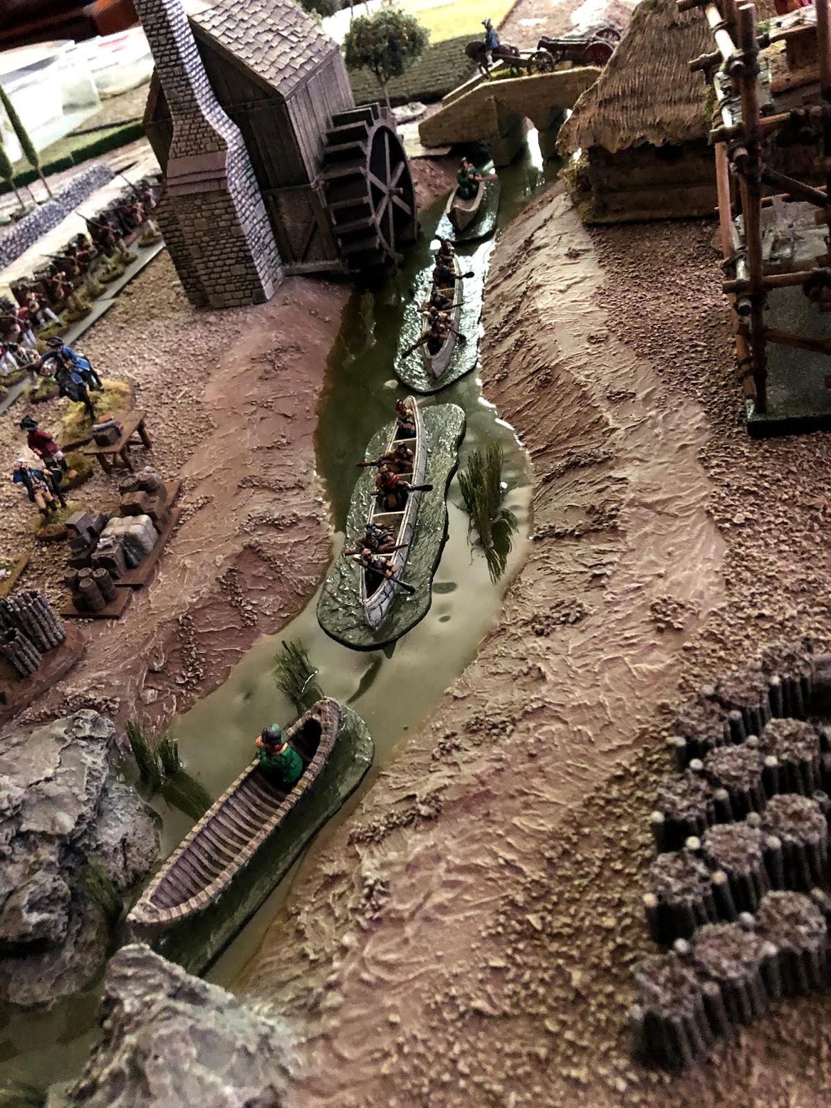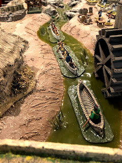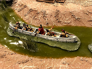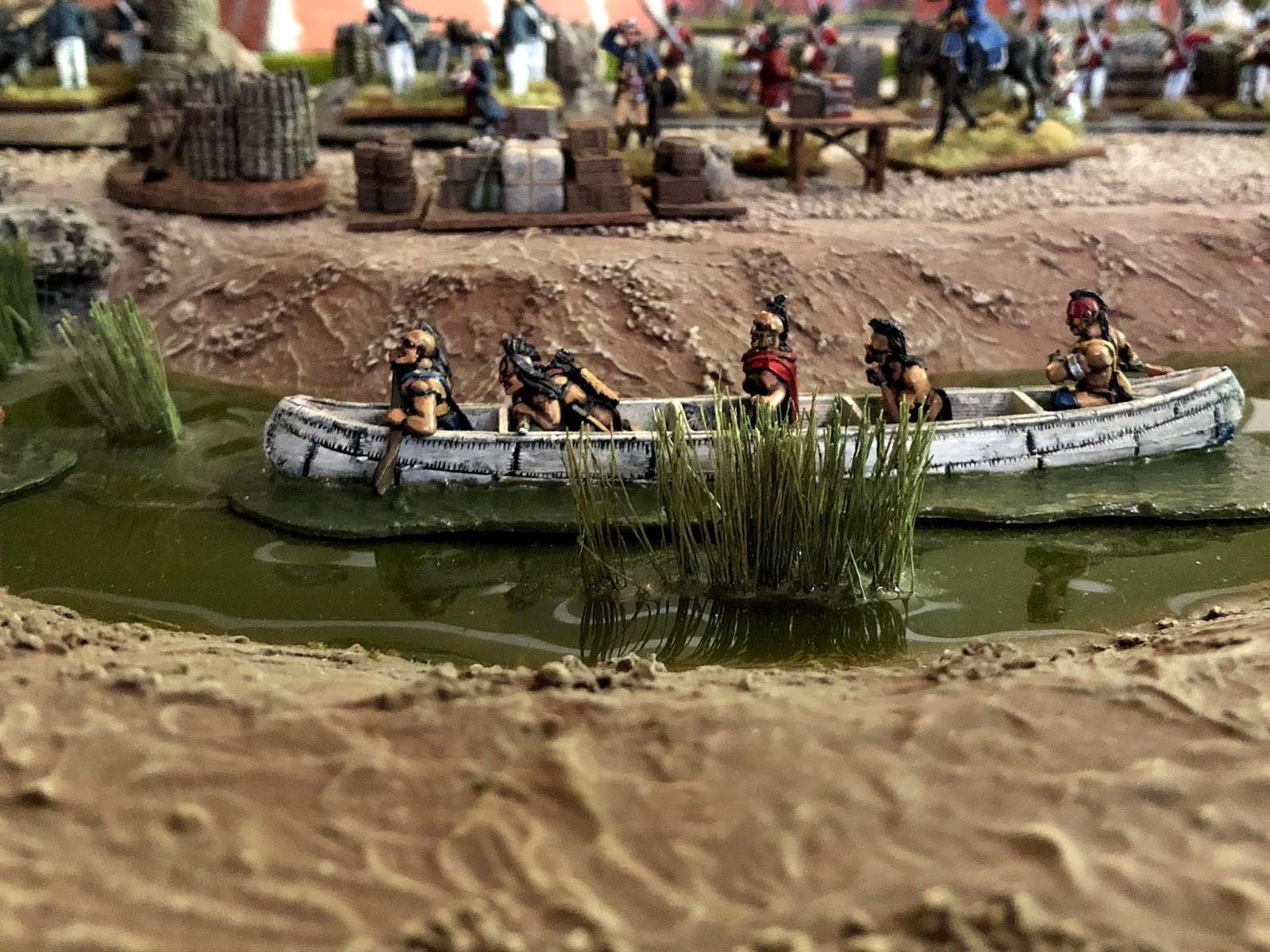 Years ago I bought some F&IW canoes with Rangers and Indians in them. They were all mounted on bases that were painted blue. That was fine since at the time I used Miniature World Maker rivers that were also blue. Then I built 10′ of river terrain boards for my Charasiab game, plus swamp to match. For years I felt I should repaint the bases on those canoes to better match my tabletop water features, but I never got around to actually doing it. Until now.