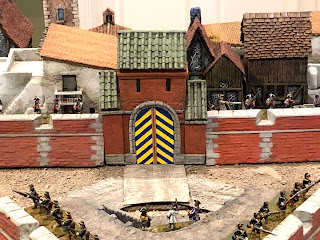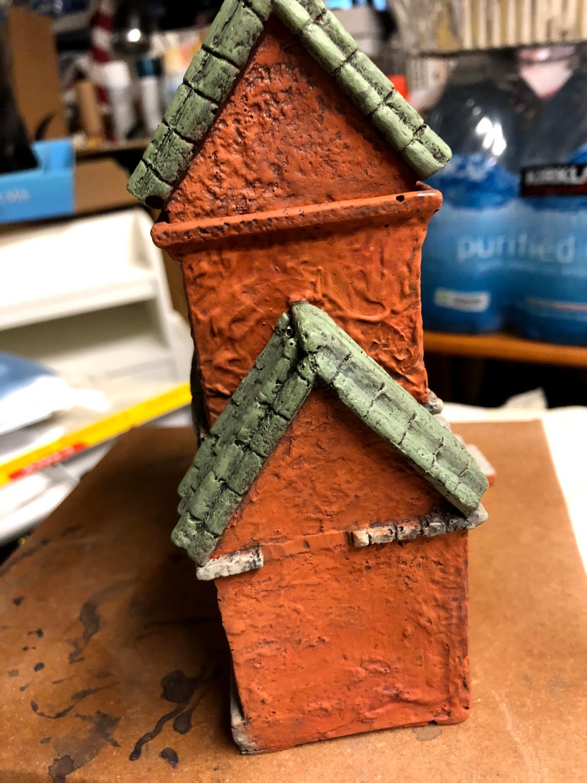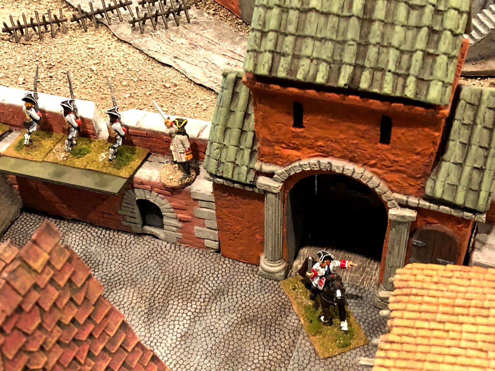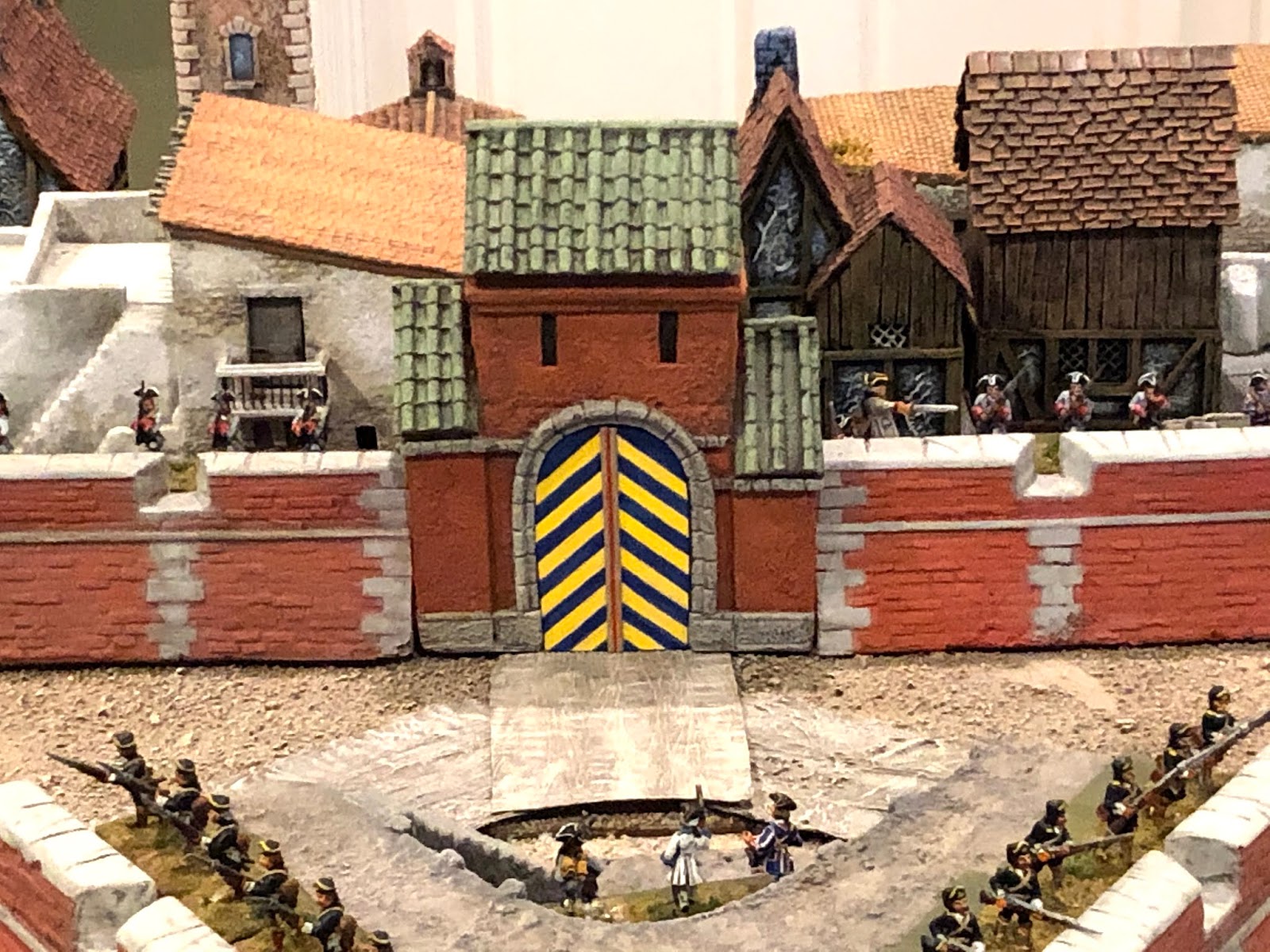 Since lightening the finish of the Vauban Gatehouse so it was a closer match to the rest of the fortress, something had been nagging at me. Looking at all of the pieces laid out together, I couldn’t help noticing that — although the colors did match much better now — the gatehouse simply looked too bright and fresh and clean. I knew this was because I had painted the lighter shading over the weathered finish BUT had chosen NOT to do one last weathering wash on top of that last lighter coat of paint. This wasn’t due to laziness. It was due to me worrying about damaging the portions of the model I had covered in wood filler. The weathering process uses a hair-dryer. The heat is no problem for wood or resin or hard plastic materials, but it poses a risk to wood-filler, which can start to dissolve away in the heat. I had experienced this ill effect when weathering my Afghan hill tower and wanted to avoid a repeat.