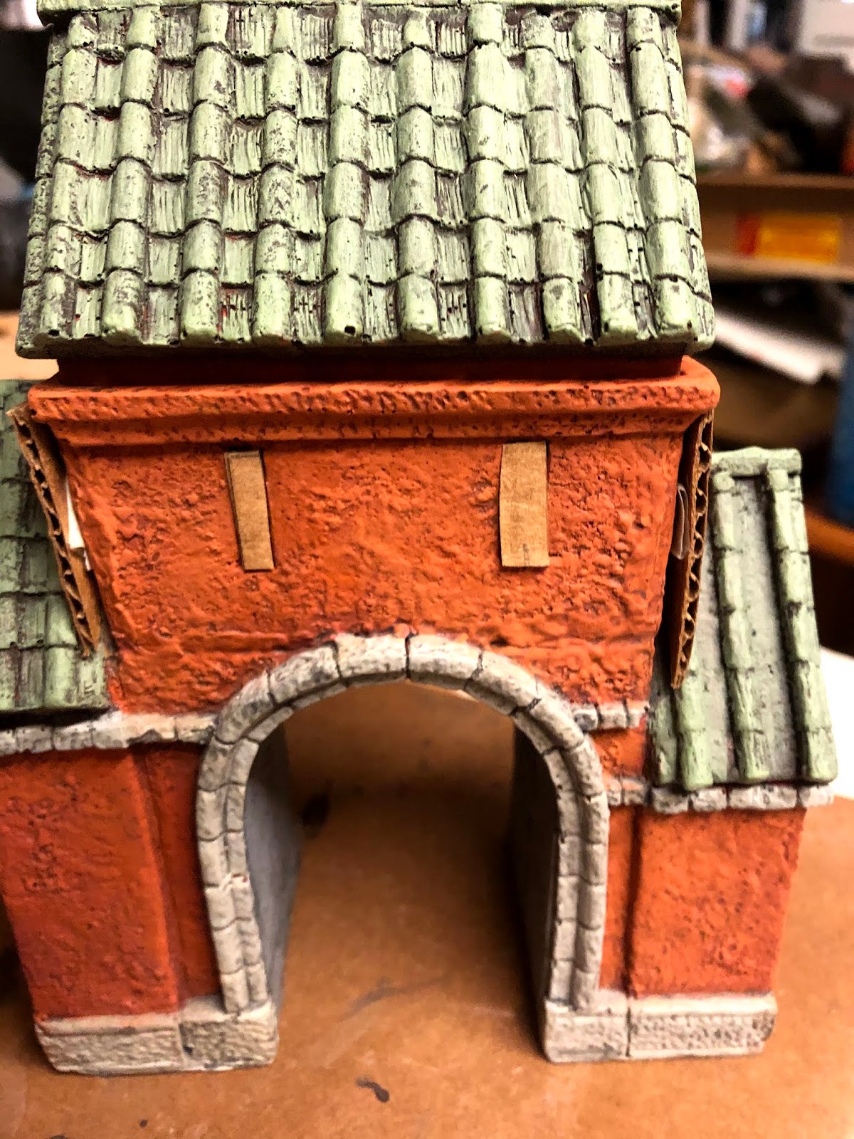 After pondering this dilemma on-and-off for a while I had a breakthrough: I could make some mini “heat shields” to cover the sections at most risk. I used a piece of spare cardboard box, since it had multiple layers and seemed like it would provide good protection. I think it turned out well, and I feel like this FINAL finish helps the Gatehouse fit much better and blend in pretty seamlessly with the rest of the fortress…